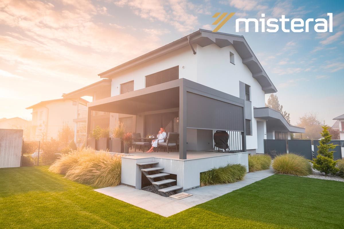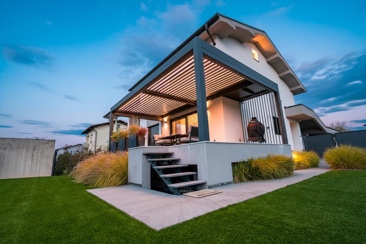 Na sodobni novogradnji na Štajerskem stoji elegantna bioklimatska pergola v prefinjeni beli barvi RAL 9010, ki je popolna rešitev za brezskrbno bivanje na prostem v vseh vremenskih razmerah.