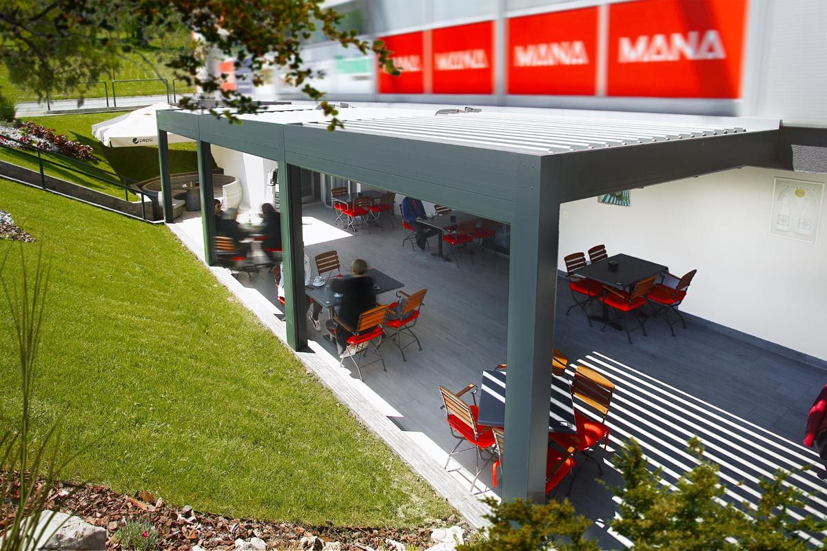 Bioklimatska lamelna pergola v gostinskem lokalu ob trgovskem centru.