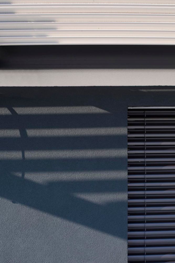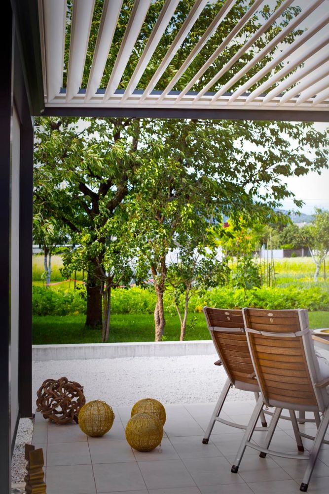Na terasi je postavljena bioklimatska pergola iz dveh večjih in enega manjšega polja vzporednih lamel. Na eni strani je vpeta v steno hiše, na drugi podprta s štirimi stebri.