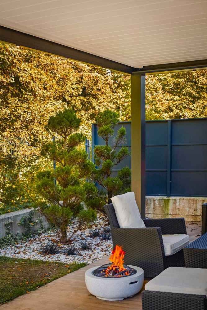 Pergola ima na vseh straneh ZIP screen roloje (v bež barvi), kar omogoča prijetno bivanje pod pergolo ne glede na letni časi in vreme, saj učinkovito ščitijo pred vetrom, dežjem, snegom in soncem. Kot dodatek ima pergola tudi LED luči, senzor za dež Somfy in grelnike za zimske dni.