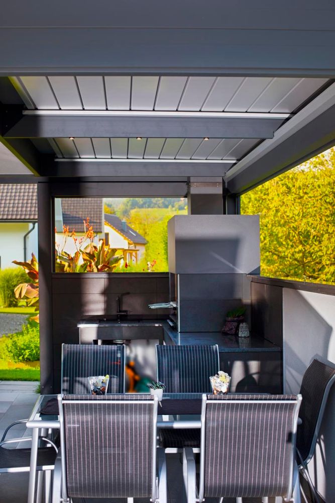 Elegantna bioklimatska pergola v barvi RAL 7016 (antracit) na terasi.