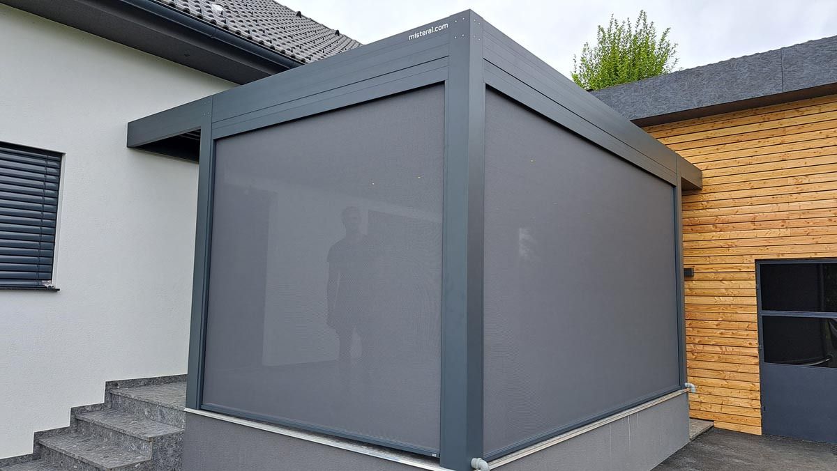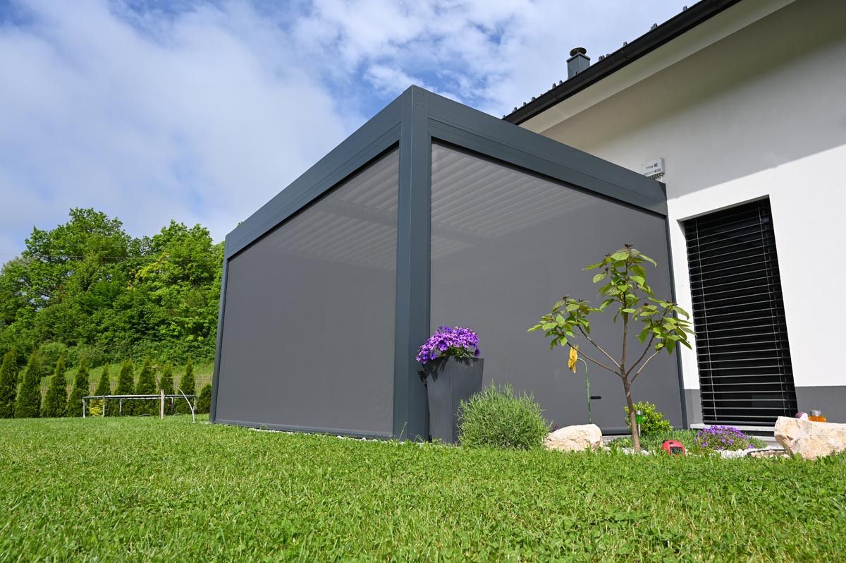 Bioklimatska pergola v elegantni antracit barvi (RAL 7016). S svojo preprosto in hkrati dovršeno zasnovo ponuja udobno zavetje za bivanje na prostem v vseh letnih časih.