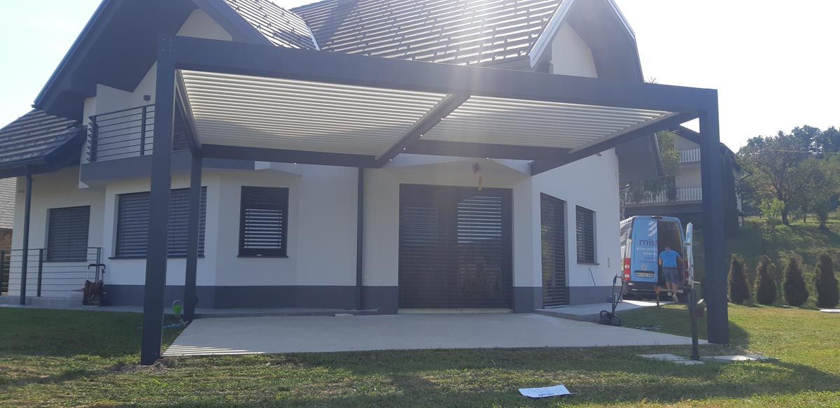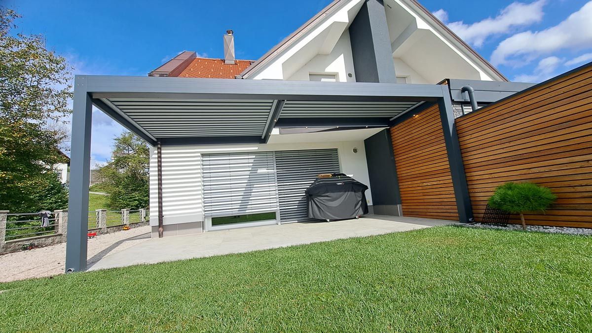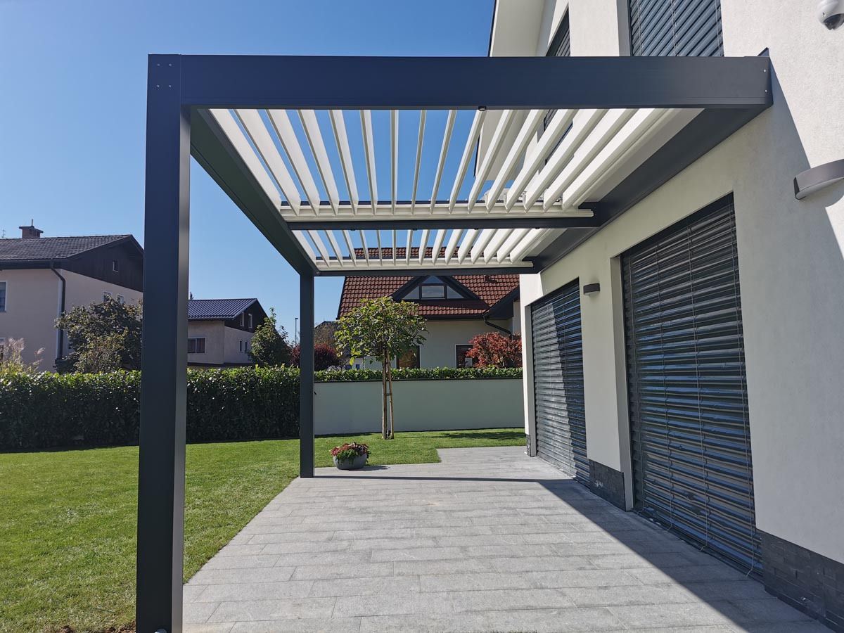 Na terasi pred hišo je postavljena bioklimatska pergola v kombinaciji antracit konstrukcije (RAL 7016) in belih lamel (RAL 9010), katera ustvarja prijeten zunanji prostor za bivanje v vseh vremenskih pogojih.