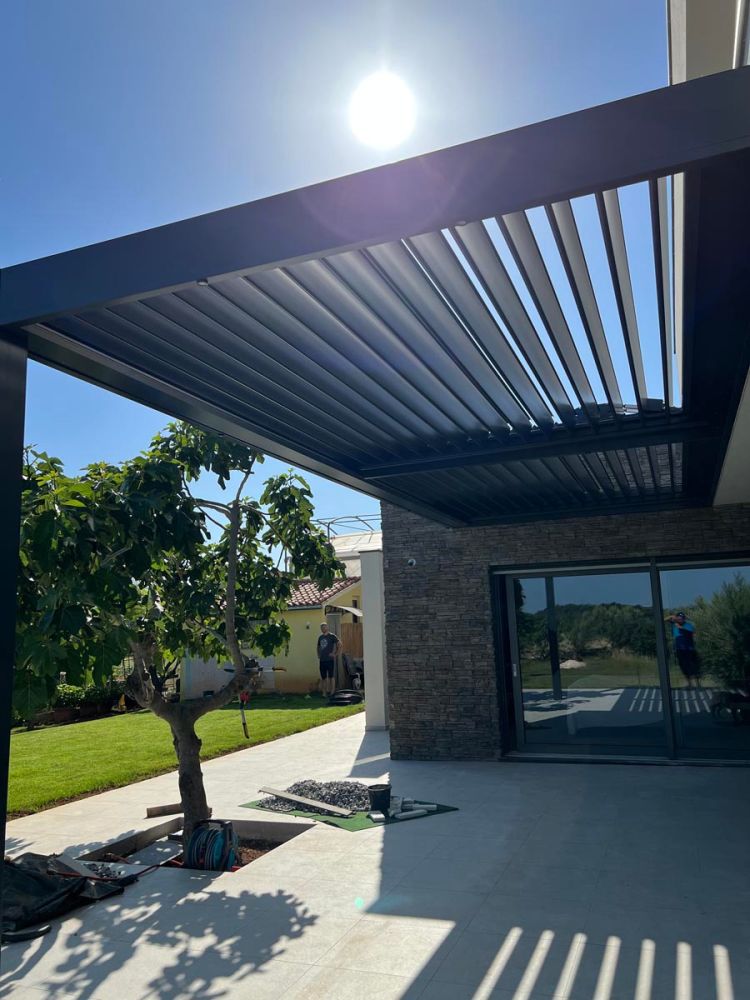 Pergola je sestavljena iz treh polj vzporednih rotirajočih lamel, ki omogočajo naklon do 160°. Konstrukcija je na eni strani natančno vpeta v steno objekta z vodotesnim stikom, kar zagotavlja trajno zaščito in estetsko celovitost, na drugi strani pa je podprta s tremi stebri, ki poskrbijo za stabilnost in uravnotežen videz.
