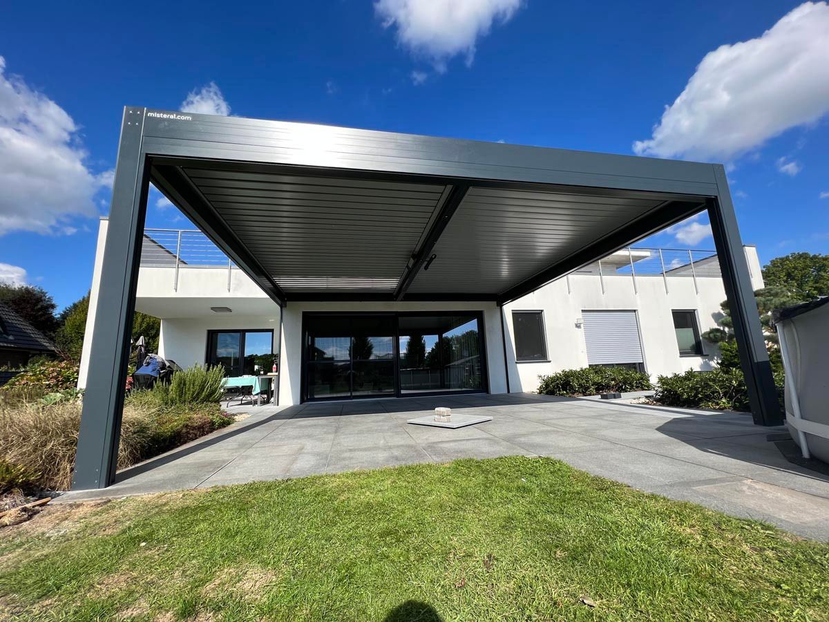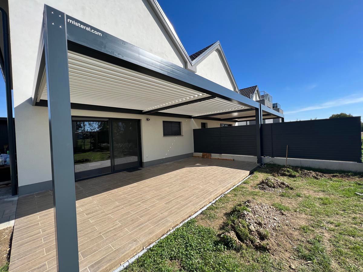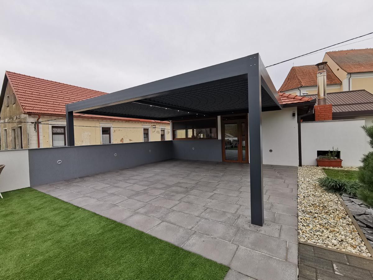 Bioklimatska pergola v elegantni antracit barvi (RAL 7016), ki se popolnoma ujema z arhitekturo objekta.