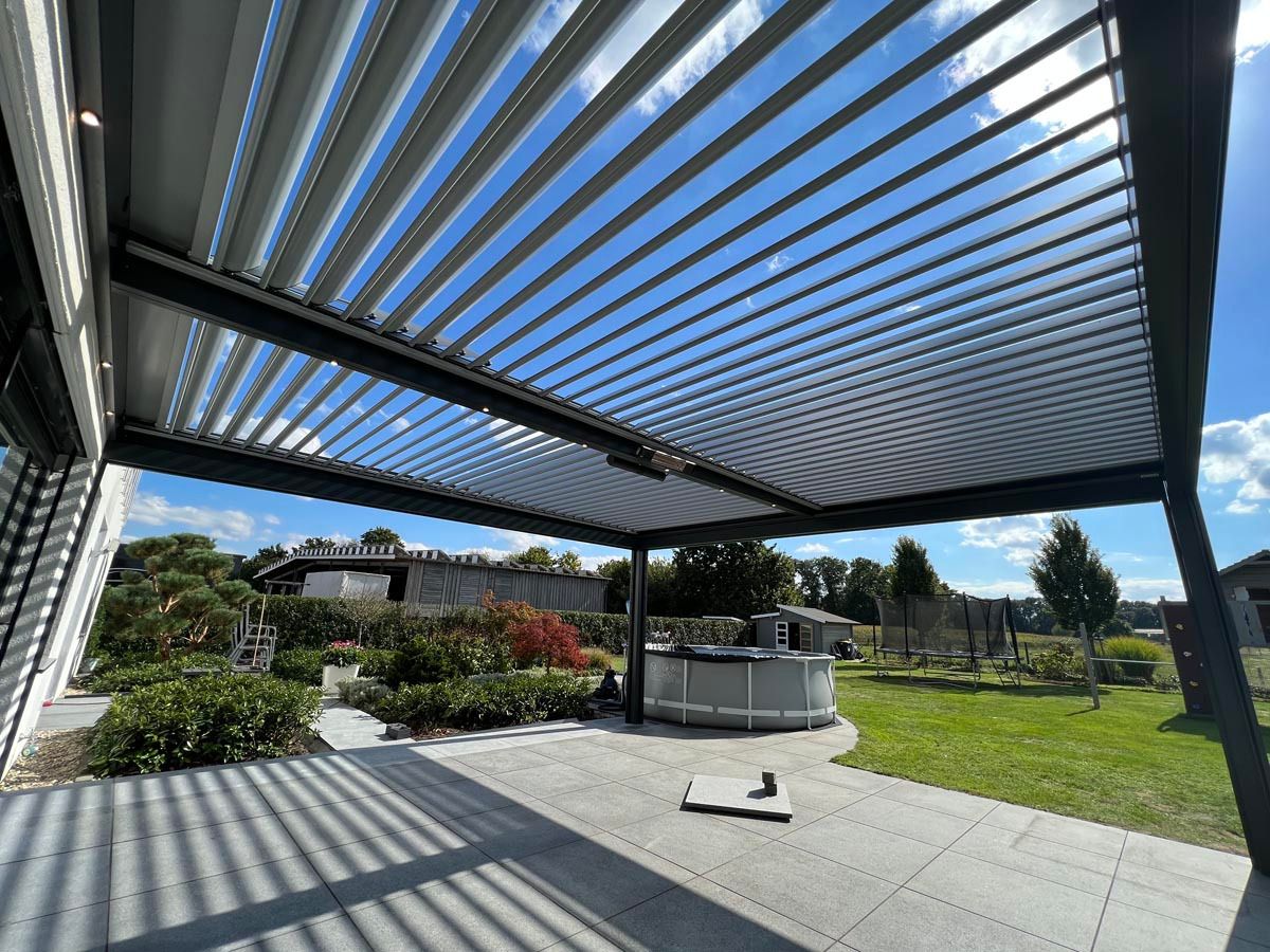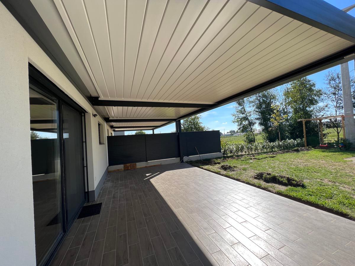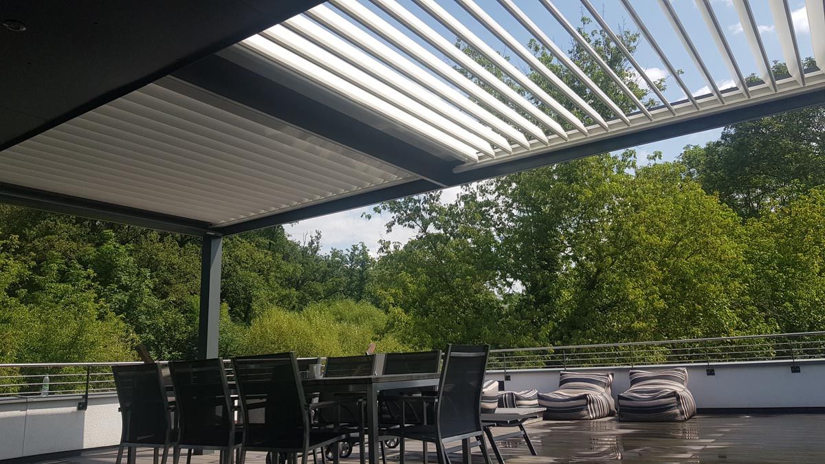 Majhna bioklimatska pergola v elegantni beli barvi (RAL 9010), ki se diskretno in estetsko zlije z že obstoječo konstrukcijo.