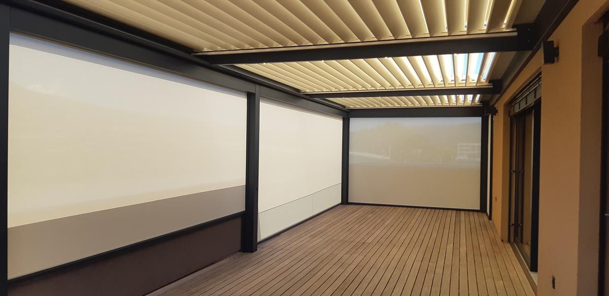 Za večjo funkcionalnost in udobje so v konstrukcijo vgrajene LED luči, ki omogočajo uporabo terase tudi v večernih urah. Na vseh stranicah so nameščeni zip screen roloji v beli barvi, ki zagotavljajo popolno zaščito pred soncem, vetrom in radovednimi pogledi.