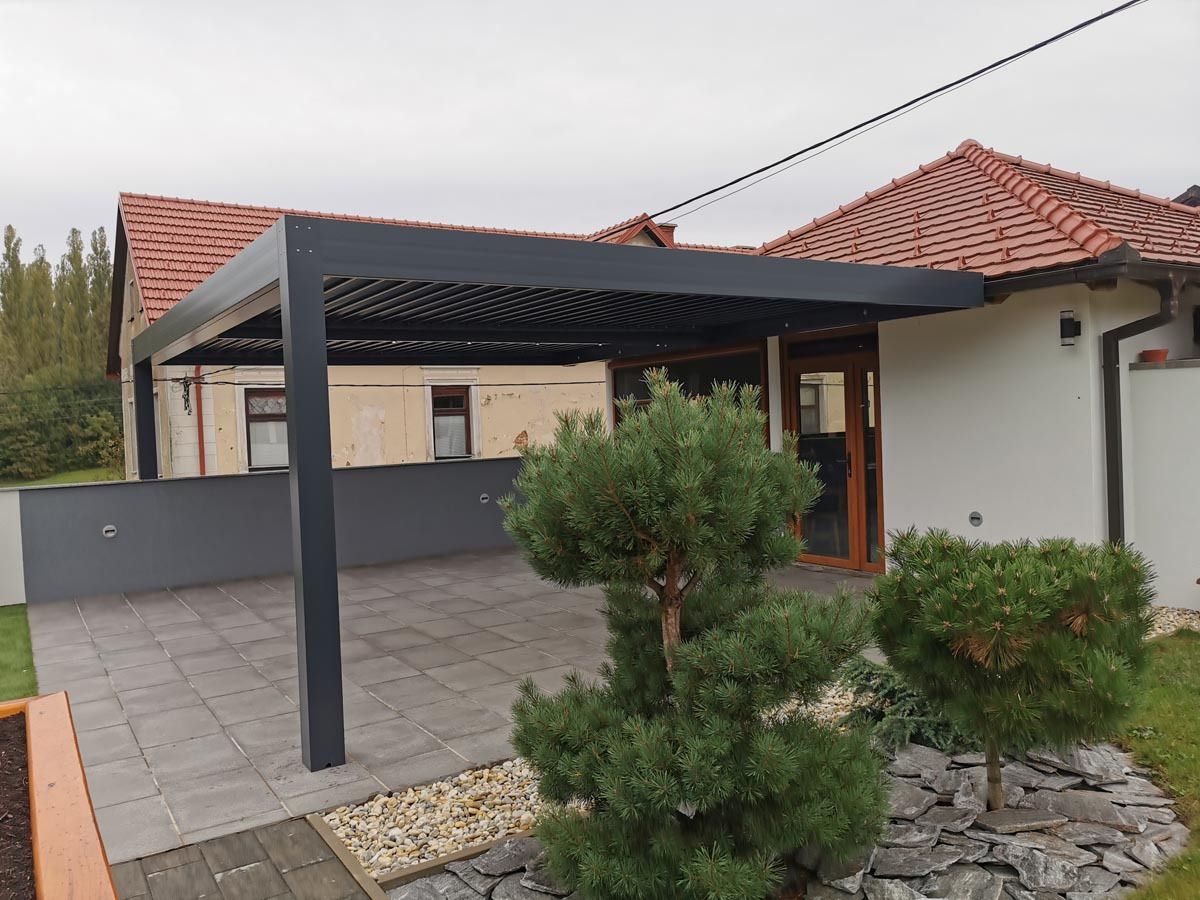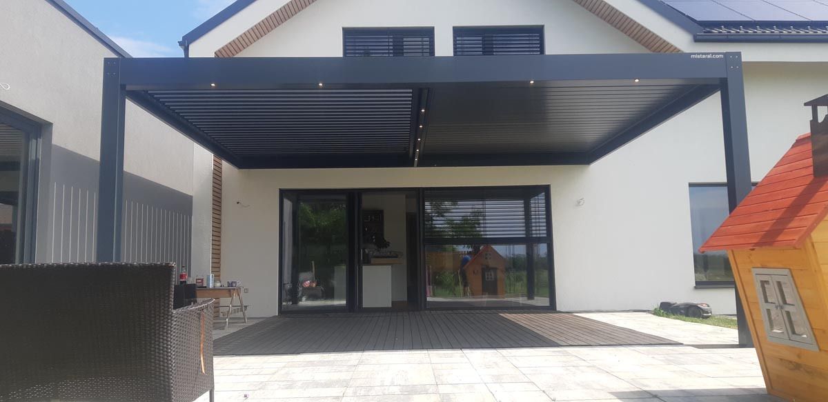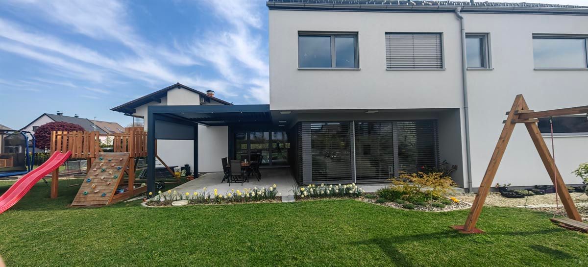 Na čudoviti novogradnji na Štajerskem stoji elegantna bioklimatska pergola v antracit barvi (RAL 7016), ki se s svojim sodobnim videzom odlično ujema z moderno arhitekturo hiše.
