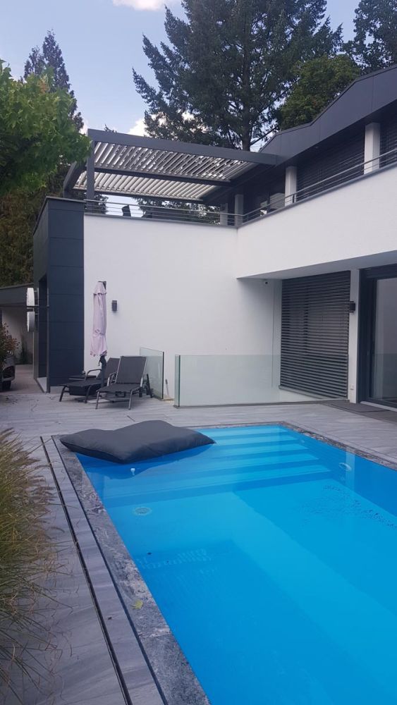 Na prostorni terasi v Nemčiji je postavljena pergola v kombinaciji antracit konstrukcije (RAL 7016) in belih lamel (RAL 9010). Kontrastna barvna izvedba se odlično sklada z arhitekturo objekta ter ustvarja sodoben in prefinjen videz.