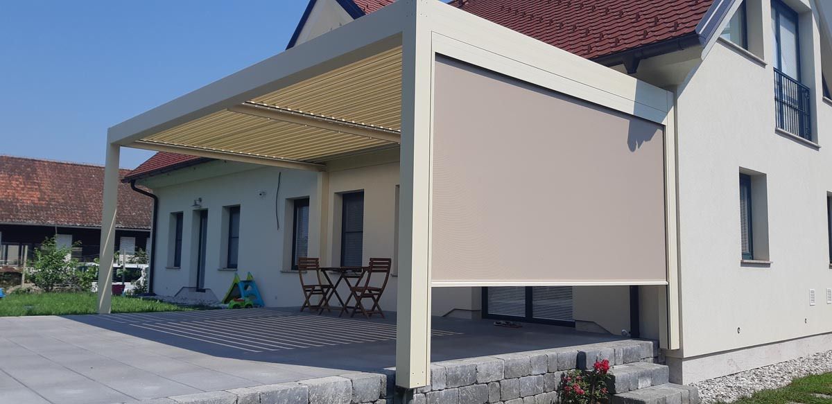 Pergola je pripeta na objekt z vodotesnim stikom, dodatno stabilnost pa ji zagotavljata dva aluminijasta stebra.