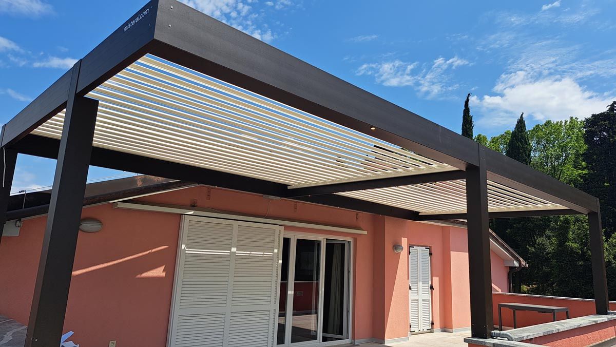 Pergola je sestavljena iz štirih polj vzporednih lamel, kar omogoča, da pokriva celotno površino terase in s tem zagotavlja popolno zaščito ter maksimalno izrabo zunanjega prostora. Lamele se lahko obračajo do 160°, kar omogoča prilagoditev senčenja, prezračevanja in zaščite pred dežjem.