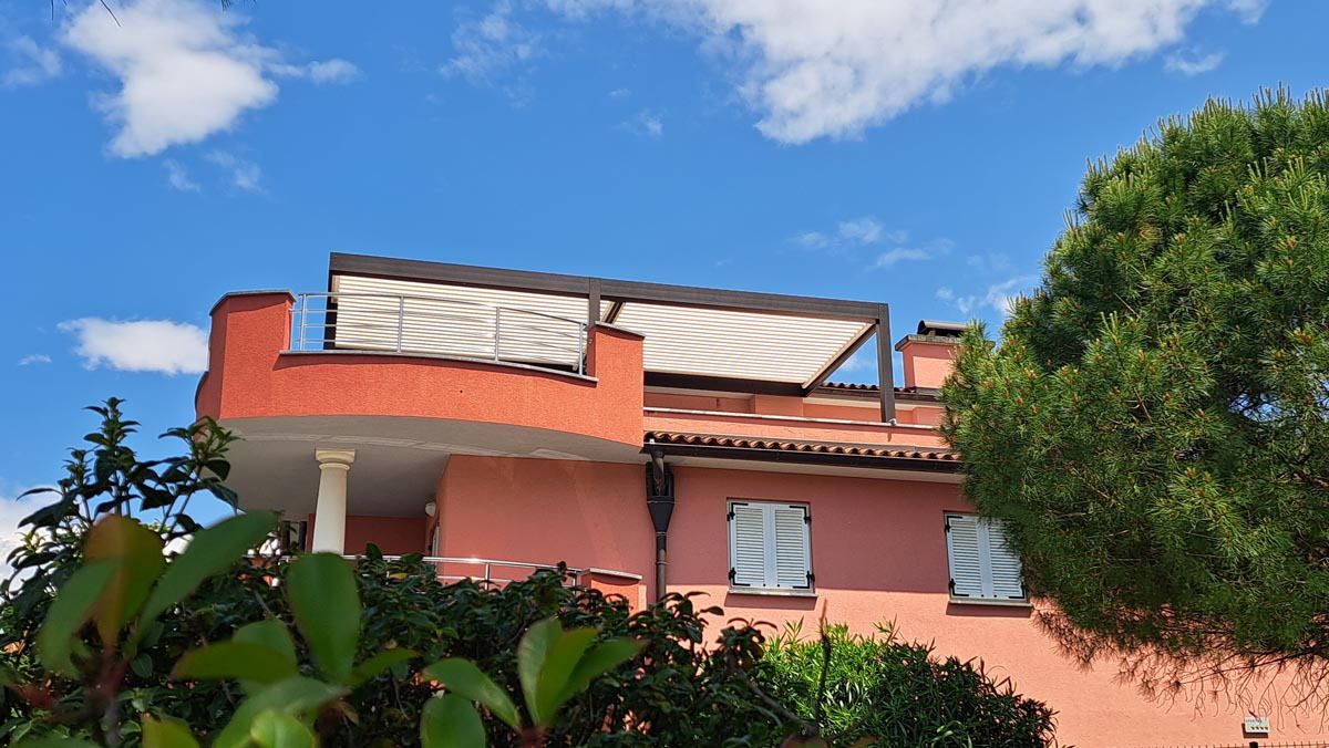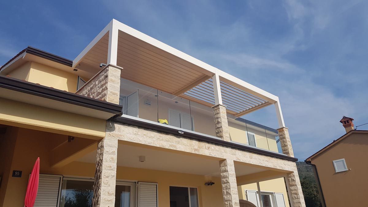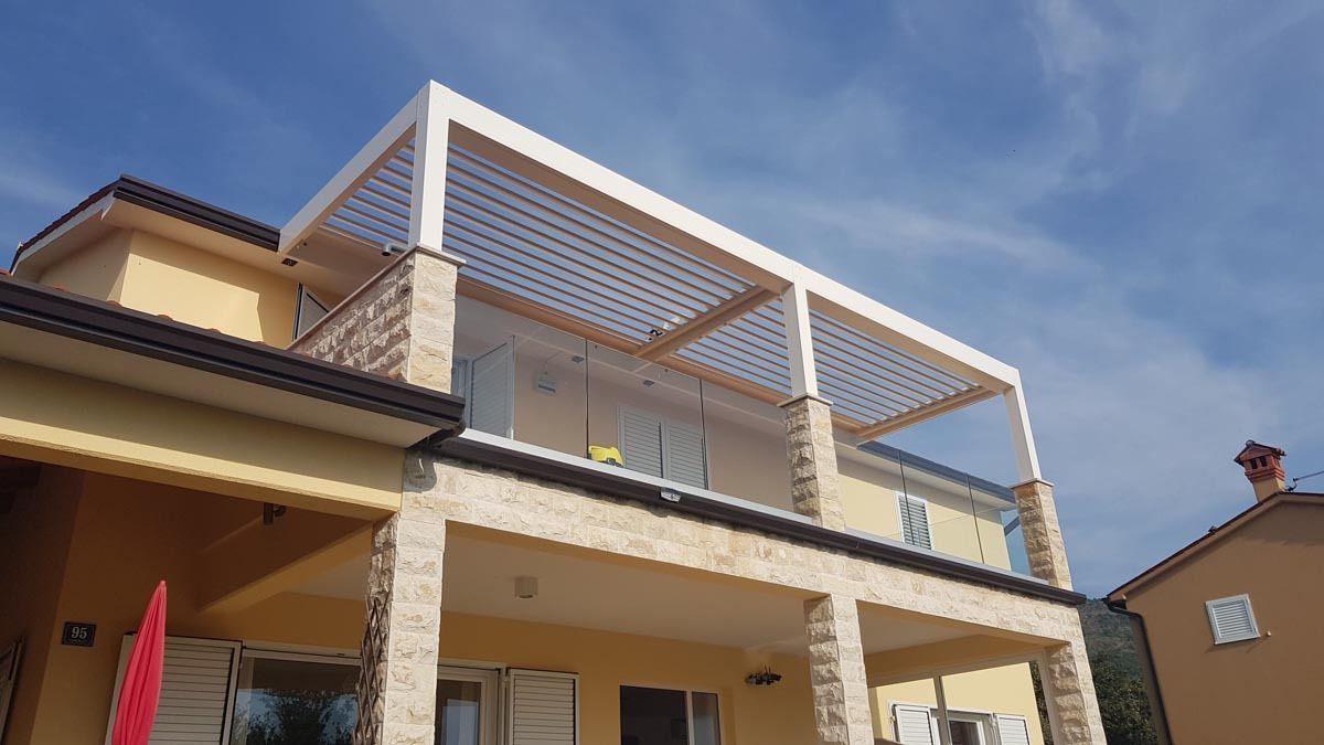 Na balkonski terasi v Rovinju je nameščena pergola v elegantni beli barvi (RAL 9010), ki prostoru daje svežino in lahkotnost ter se odlično poda obmorskemu okolju.