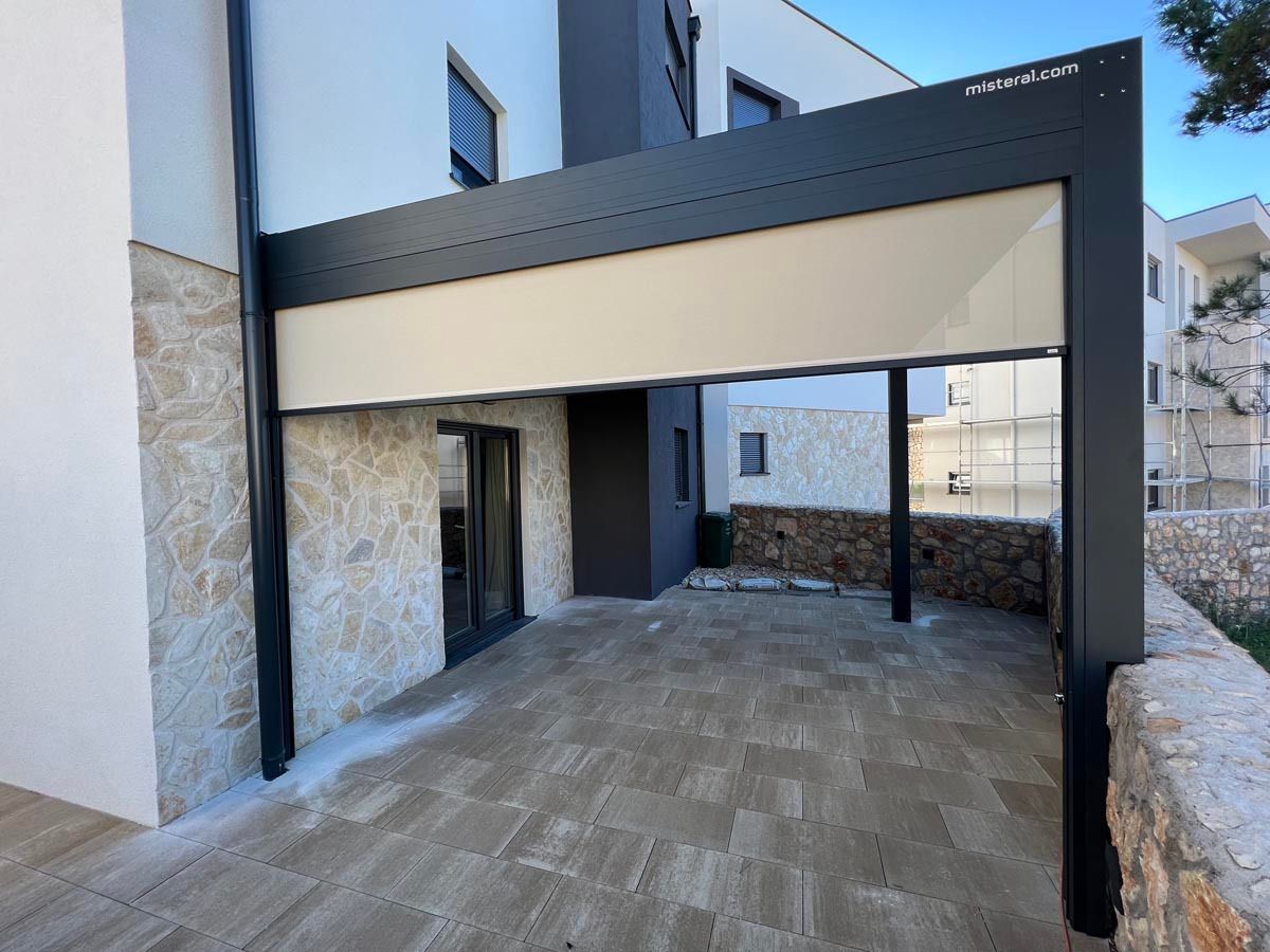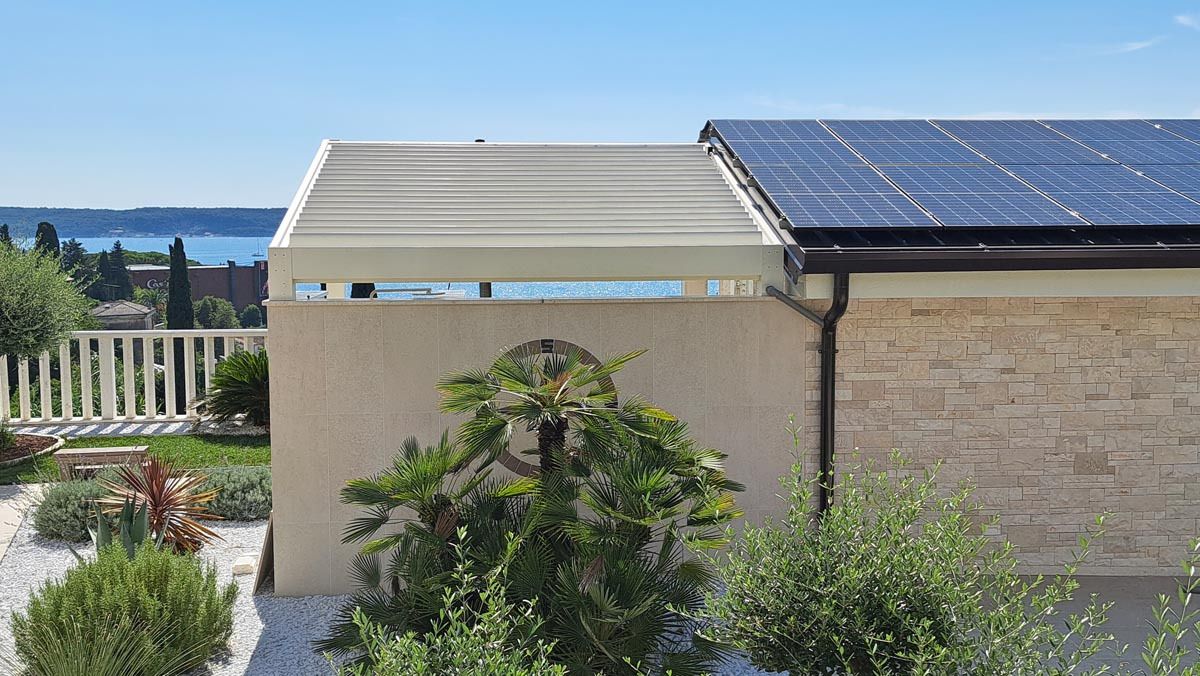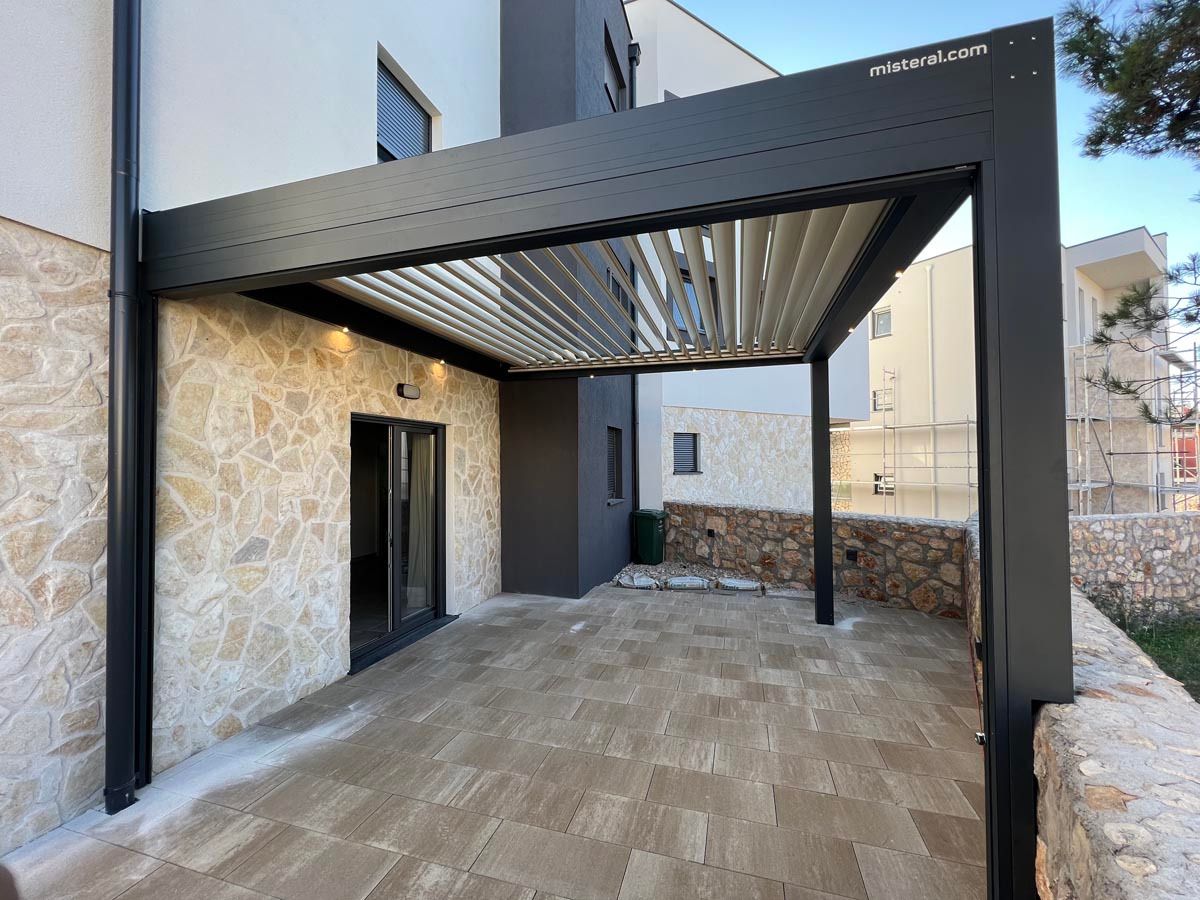 Na terasi apartmaja v Dalmaciji je postavljena bioklimatska pergola, ki združuje antracitno konstrukcijo (RAL 7016) in bele lamele (RAL 9010), kar ustvarja eleganten kontrast in se odlično poda k arhitekturi hiše.