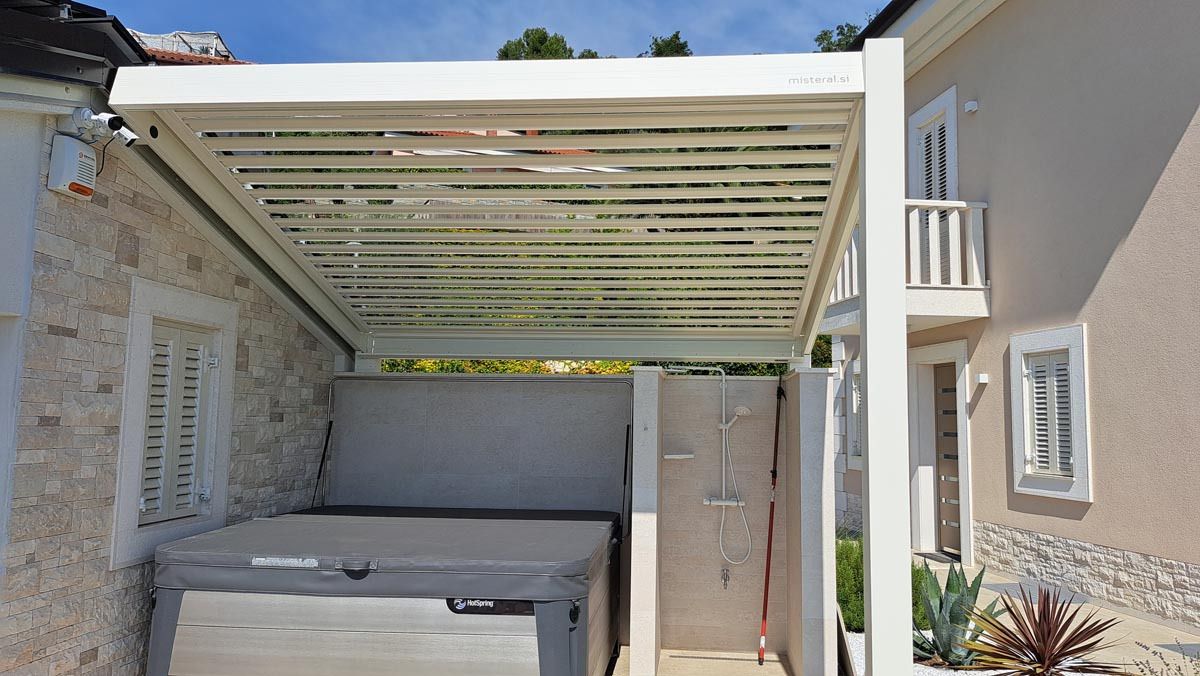 Gre za primer posebne bioklimatske pergole, ki je bila zasnovana kot individualen projekt, popolnoma prilagojen željam stranke. Zaradi specifične postavitve ima pergola nekoliko drugačen naklon, kar ji daje unikaten videz. Njena glavna funkcija je zaščita prostora z jacuzzijem, kar omogoča sproščanje in uživanje na prostem v vseh letnih časih, ne glede na vreme.