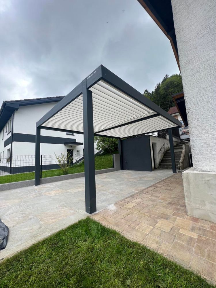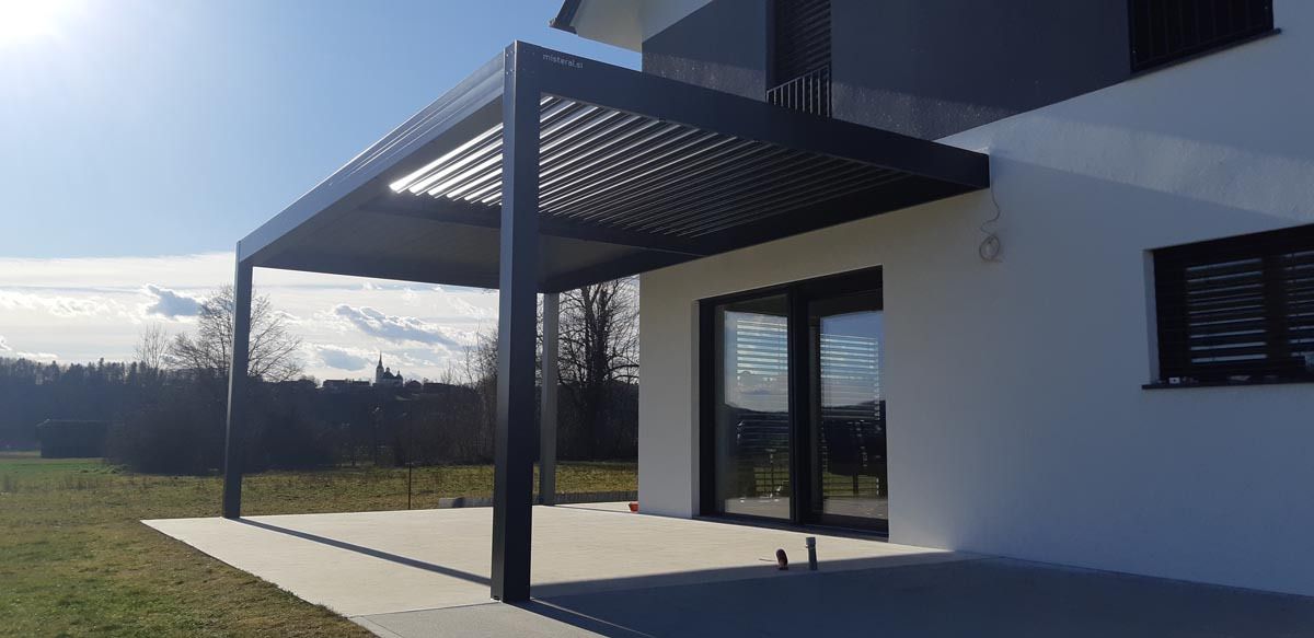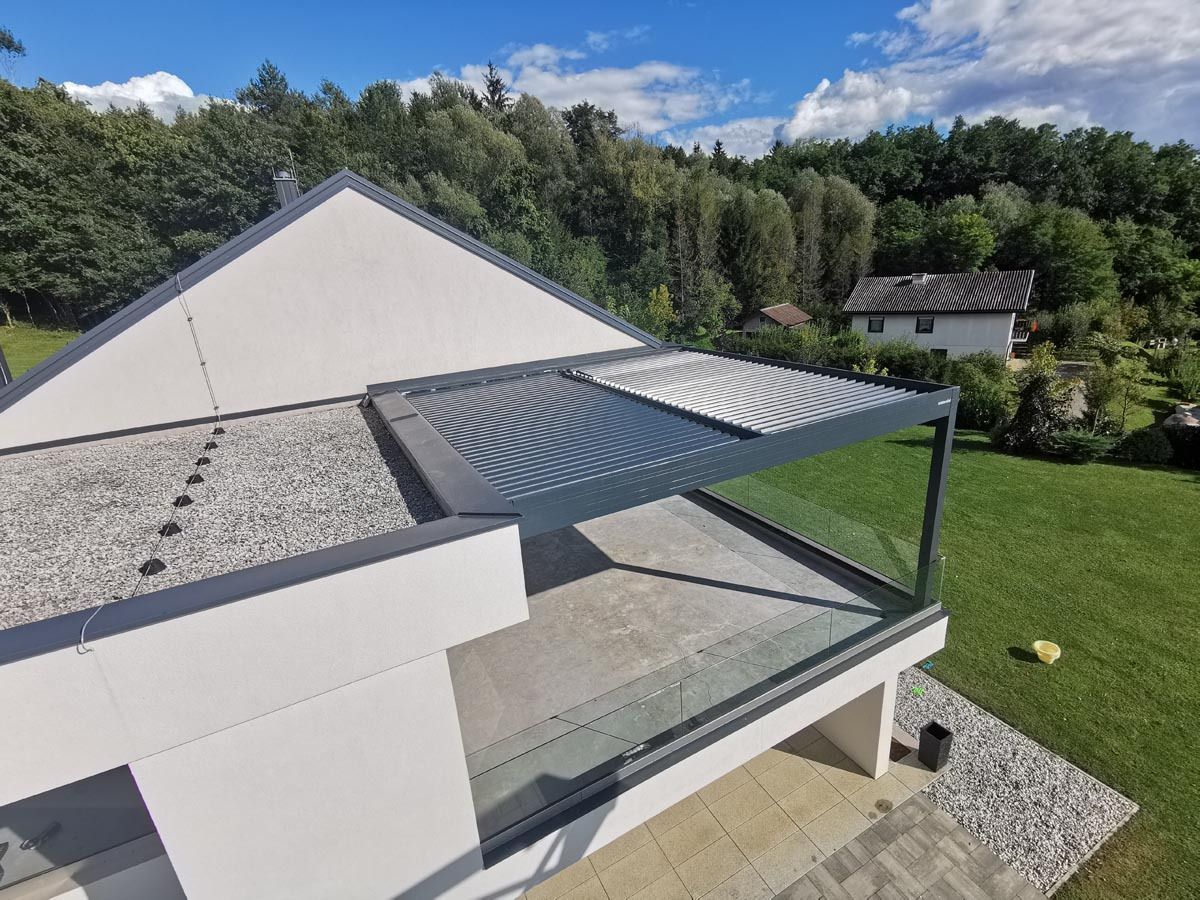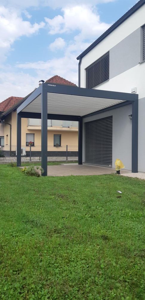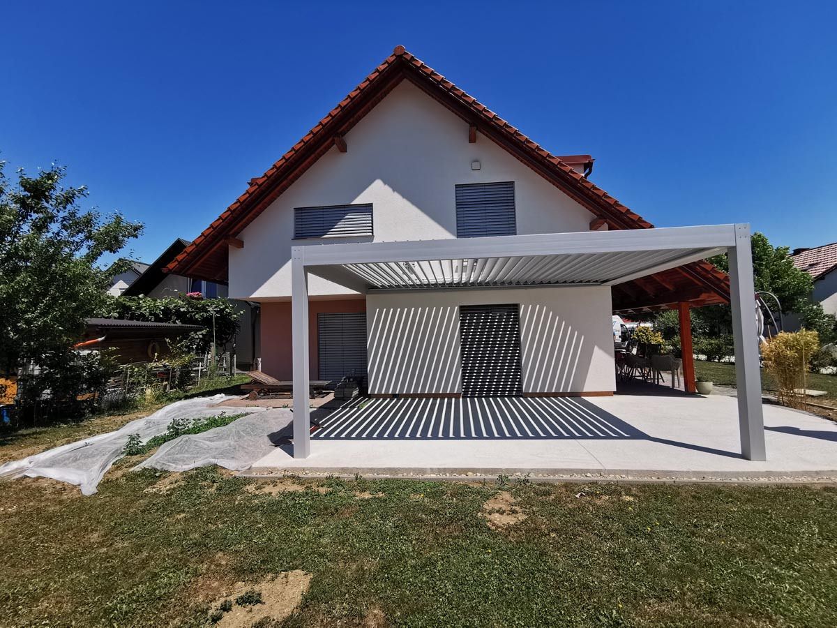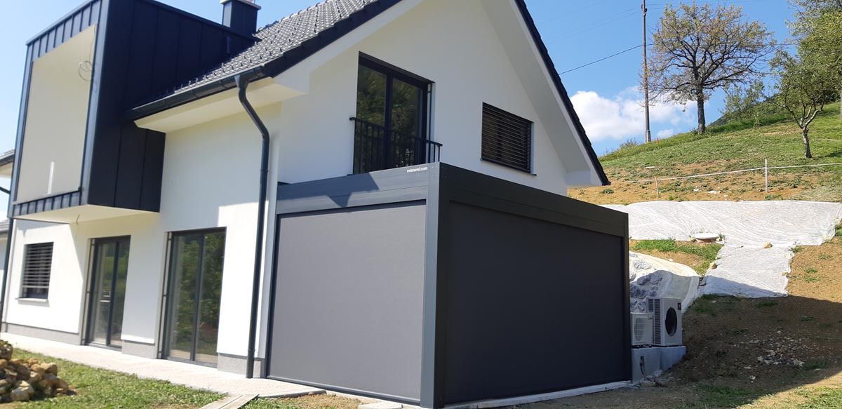 Na terasi te novogradnje je postavljena manjša, elegantna bioklimatska pergola, ki se popolno ujema z barvami hiše in celotno arhitekturo objekta. Konstrukcija je v antracit barvi (RAL 7016), lamele so bele (RAL 9010), kar ustvarja prefinjen kontrast in sodoben videz.