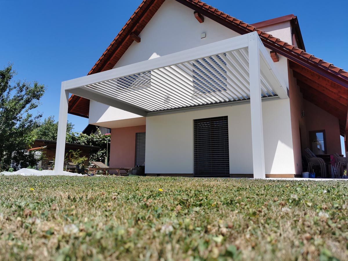 Čudovita bela pergola v barvi RAL 9010 krasi teraso sodobne novogradnje ter s svojim svežim in elegantnim videzom popolnoma dopolnjuje arhitekturo hiše.