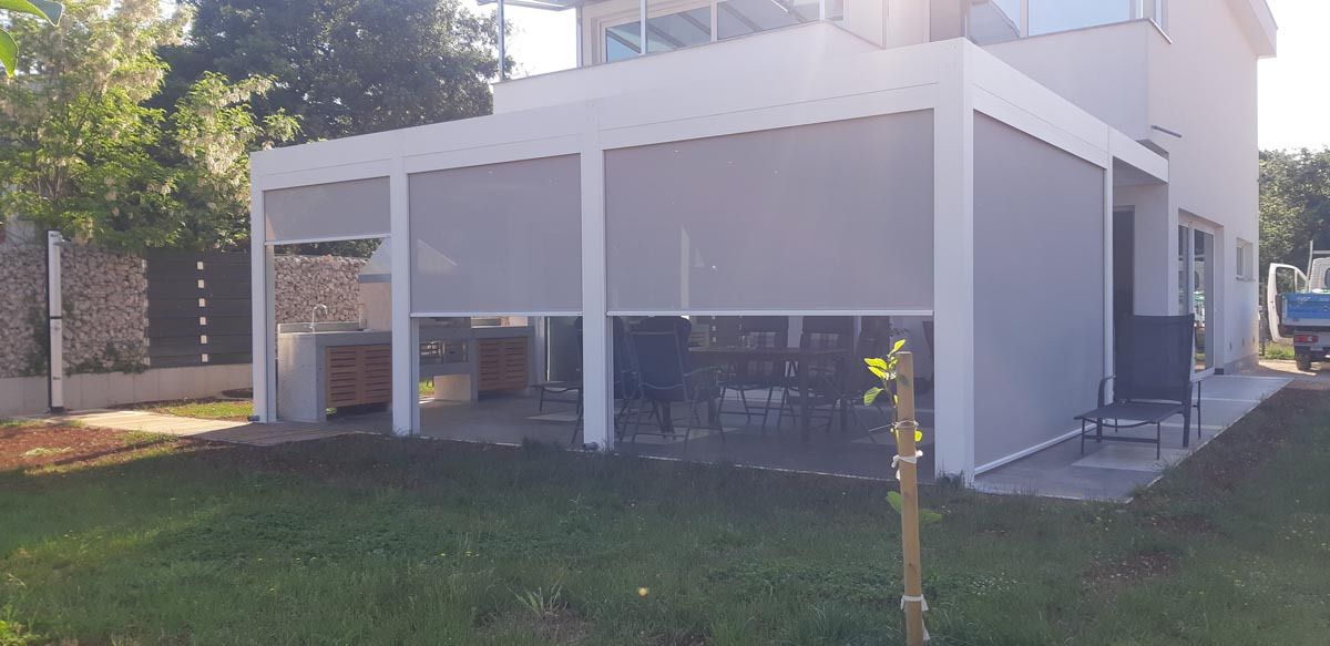 V pergolo so integrirane LED luči, ki ustvarjajo prijeten ambient v večernih urah, medtem ko štirje zip screen roloji v elegantnem sivkastem odtenku poskrbijo za dodatno zaščito pred soncem, vetrom in pogledi ter se barvno odlično podajo tako k hiši kot k beli konstrukciji.