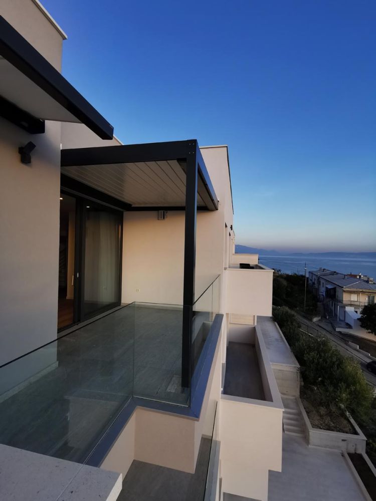 Na balkonski terasi v Splitu je postavljena manjša bioklimatska pergola, ki s svojo elegantno zasnovo čudovito dopolnjuje prostor z razgledom na morje.
