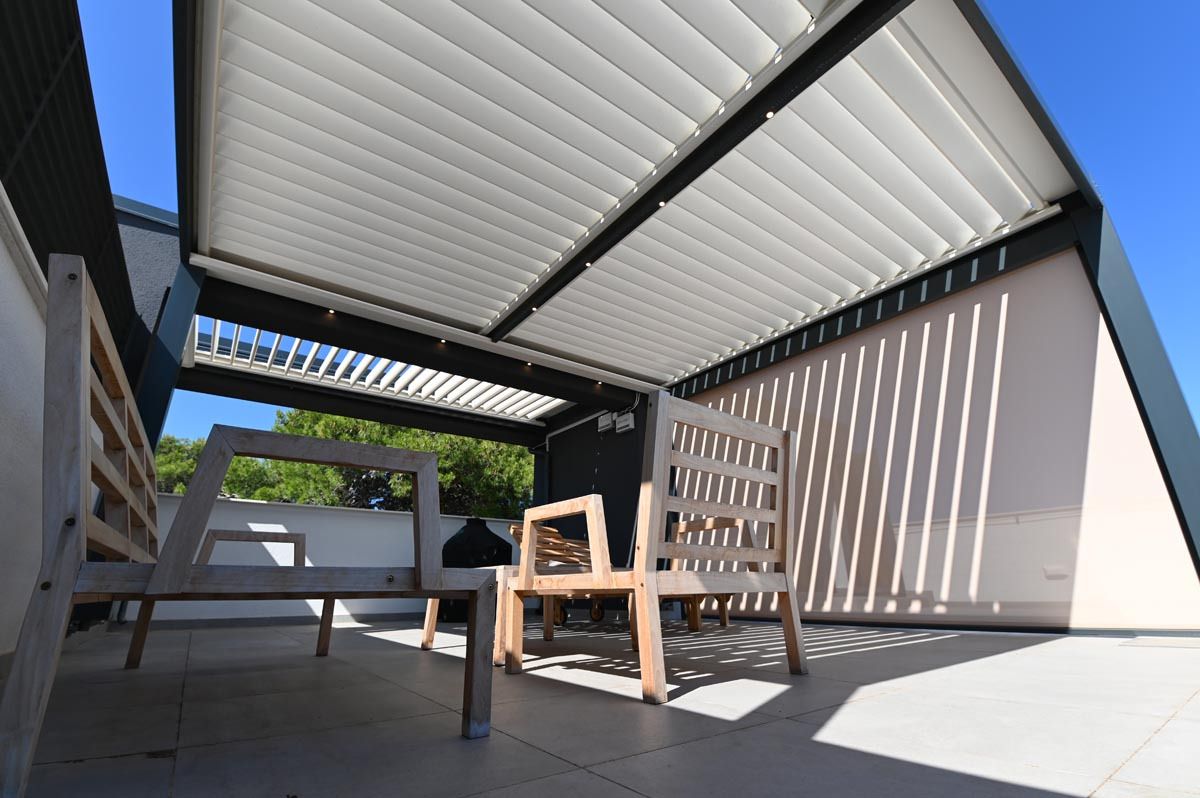 Elegantna pergola je v celoti v beli (RAL 9010) barvi in se vizualno popolnoma ujema z arhitekturo svetle mediteranske hiše. Sestavljena je iz enega polja vzporednih lamel, ki omogočajo rotacijo in s tem nadzor nad svetlobo, zračenjem ter zaščito pred dežjem.