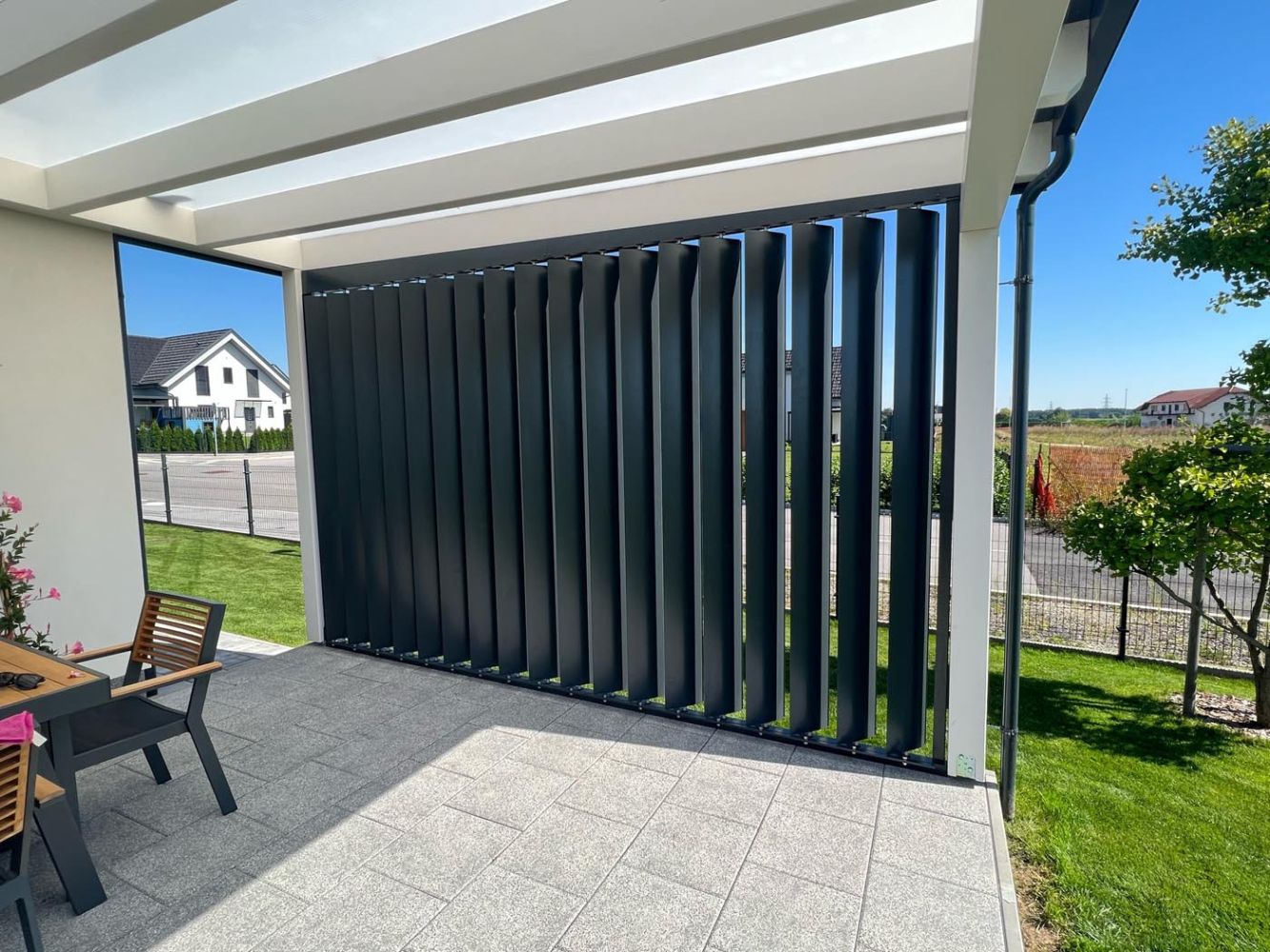 Ta rešitev je praktična in estetsko dovršena, saj omogoča prilagodljivo senčenje – sami določate, koliko sončne svetlobe in toplote bo prepuščene na teraso, hkrati pa ohranite občutek prostornosti in odprtosti.