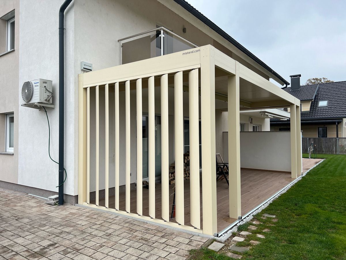 Pergola je na eni stranici dopolnjena z brisoleji B290 v nežnem odtenku umazano bele / bež (RAL 1015), kar ustvarja prijeten, svetel in eleganten videz terase.