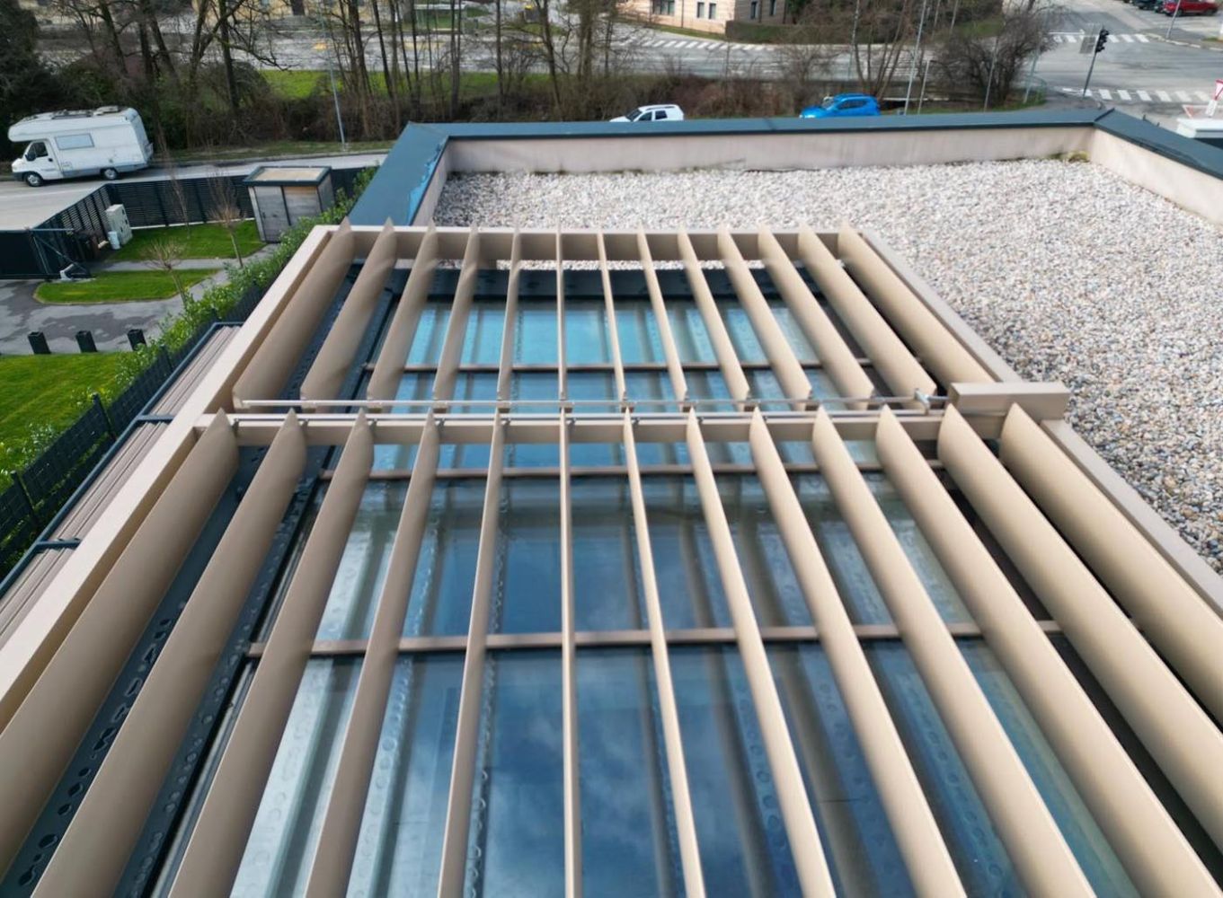 Brisoleji so nameščeni vertikalno, kar omogoča učinkovito senčenje in zaščito pred nizkim soncem ter radovednimi pogledi, hkrati pa ohranja odprt občutek prostora in poudarja višinske linije konstrukcije.