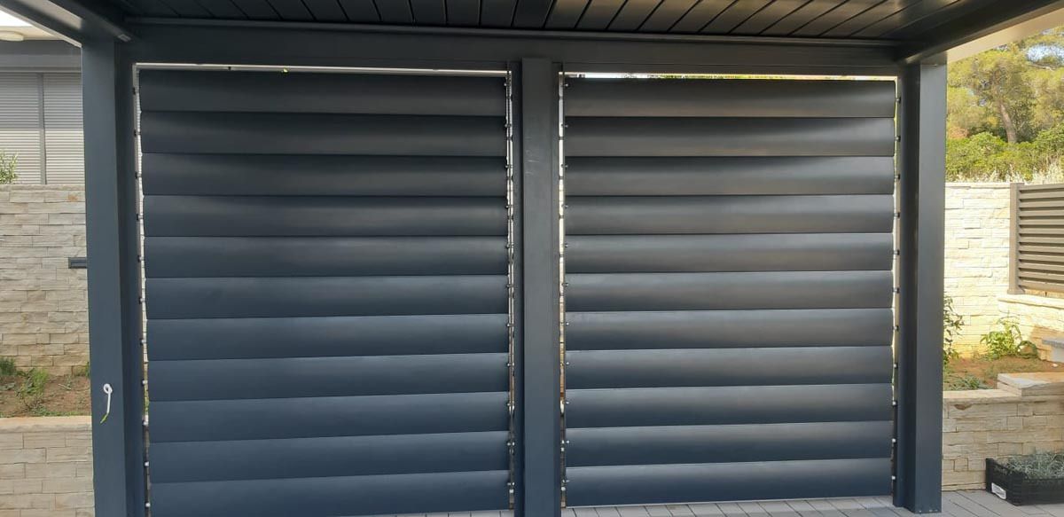 Brisoleji so nameščeni na krajši stranici pergole in vpete v trdno aluminijasto konstrukcijo, kar zagotavlja stabilnost tudi ob močnejšem vetru. Montaža je diskretna – pritrdijo se na konstrukcijo pergole, motorni pogon pa je skrit v zgornji del, zato celota deluje estetsko dovršeno in harmonično.