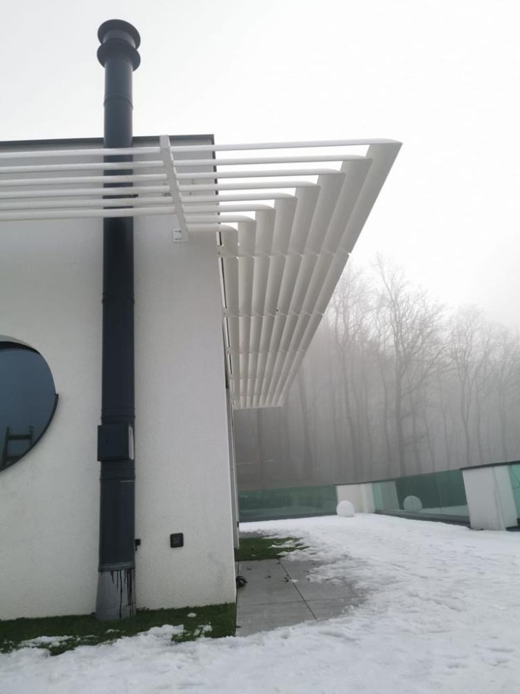 Na hiši so nameščeni brisoleji posebne trikotne oblike na velikem oknu, izvedeni v elegantni beli barvi RAL 9010, ki se odlično ujema s celotno barvno paleto hiše.