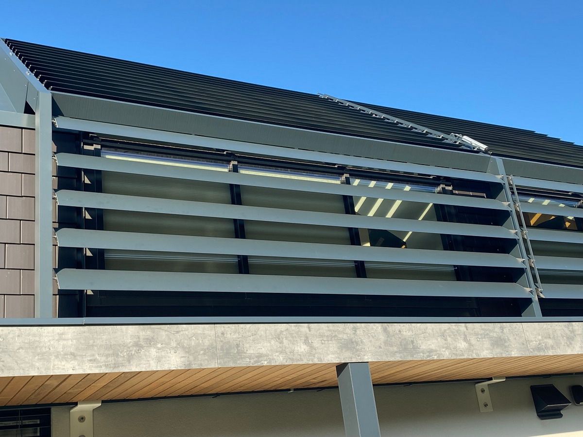 Na balkonski terasi so postavljeni brisoleji v elegantnem antracitnem odtenku RAL 7016, nameščeni na vseh odprtih stranicah.