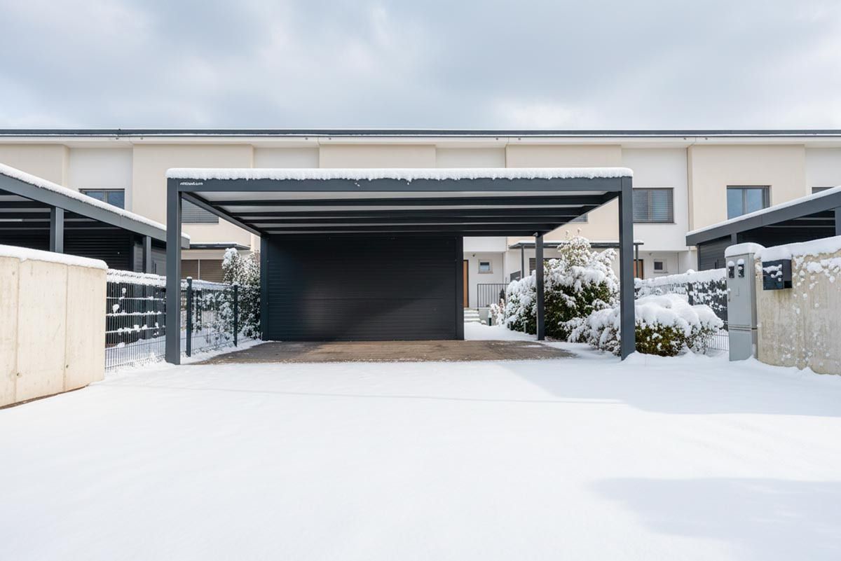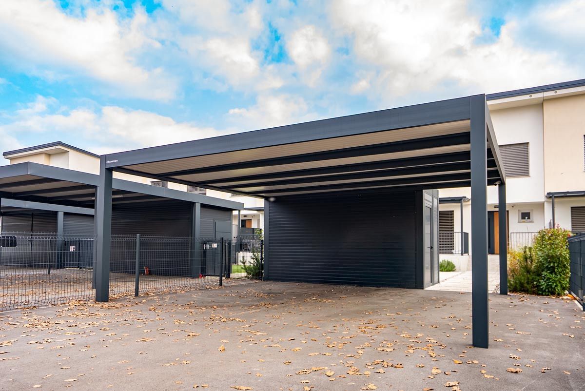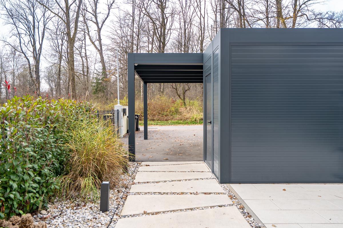 Kot premišljena dopolnitev carportu je zraven nameščena lopa v antracit barvi (RAL 7016), izdelana iz aluminija, ki omogoča priročno shranjevanje opreme in orodja ter ohranja urejenost zunanjega prostora. Združitev carporta z lopo ustvarja celovit, funkcionalen in estetsko dovršen kotiček, ki se harmonično sklada z arhitekturo hiše in zagotavlja praktično uporabo ter zaščito vozil skozi vse leto.